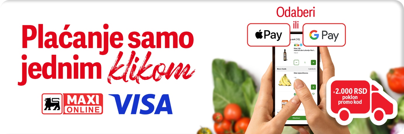 Plaćaj brzo, sigurno i jednostavno - napravi porudžbinu na Maxi Online u vrednosti od 7.500 RSD ili više i ostvari promo kod od 2.000 RSD za sledeću porudžbinu. Pravo na promo kod možeš ostvariti jednom, u periodu od 1. do 31. decembra 2025. godine. Promo kodovi su količinski ograničeni, zato požuri! Digitalno plaćanje nikada nije bilo isplativije!