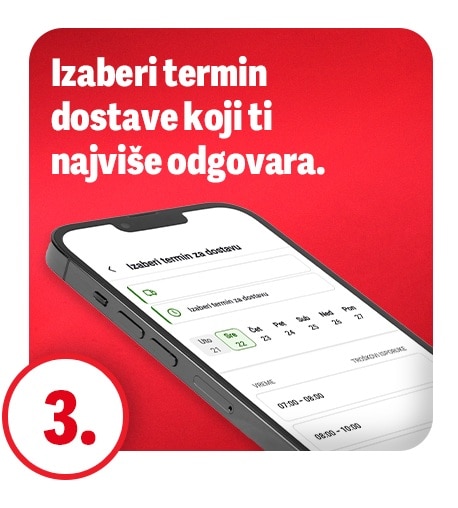 Odaberi termin dostave koji se uklapa u tvoj dnevni raspored, a mi ćemo se pobrinuti da tvoja porudžbina stigne tačno na vreme.
