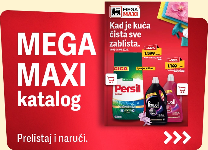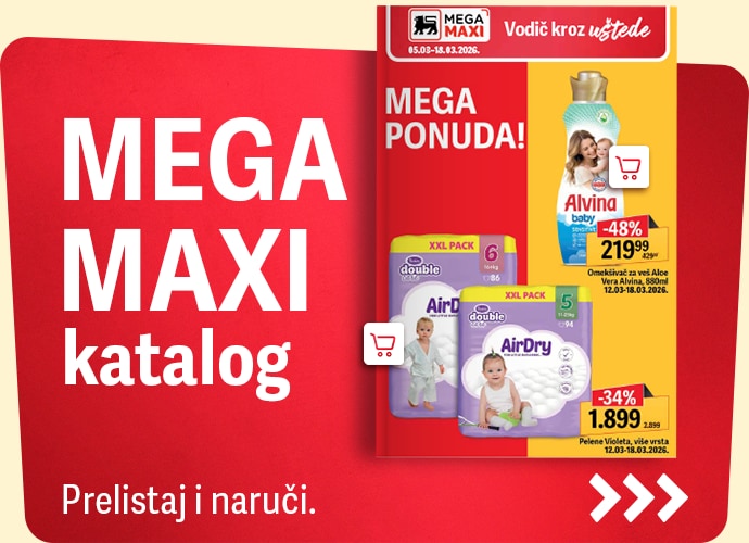 Mega Maxi je tvoje savršeno mesto za kupovinu - iz mnogo razloga! Naši Mega Maxi hipermarketi su inspirativni zbog desetina hiljada artikala u okviru bogatog asortimana, ali i praktični jer imaju siguran i dovoljno veliki parking za naše posetioce. Sve je pažljivo organizovano i poređano na rafovima u objektima veličine od 2.000 do 8.000 kvadratnih metara, u kojima je svaka kupovina uzbudljiva šetnja u izobilju proizvoda. Izaberi najbliži Mega Maxi hipermarket i kreni u sjajnu kupovinu uz mega uštede!