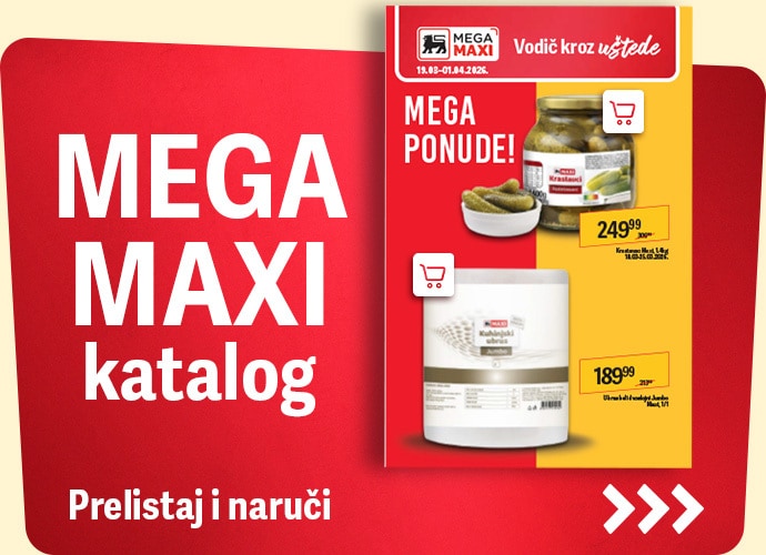 Mega Maxi je tvoje savršeno mesto za kupovinu - iz mnogo razloga! Naši Mega Maxi hipermarketi su inspirativni zbog desetina hiljada artikala u okviru bogatog asortimana, ali i praktični jer imaju siguran i dovoljno veliki parking za naše posetioce. Sve je pažljivo organizovano i poređano na rafovima u objektima veličine od 2.000 do 8.000 kvadratnih metara, u kojima je svaka kupovina uzbudljiva šetnja u izobilju proizvoda. Izaberi najbliži Mega Maxi hipermarket i kreni u sjajnu kupovinu uz mega uštede!