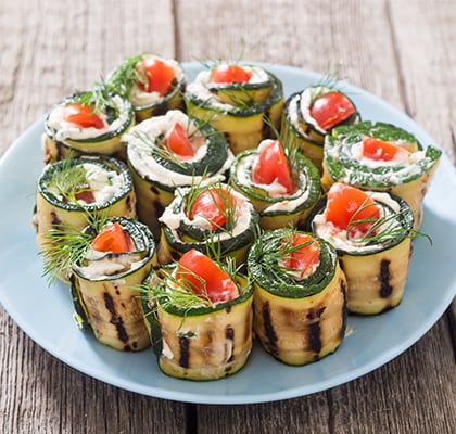Tikvicu operite i isecite uzdužno na tanke trake. Kratko ih zapecite na gril tiganju ili običnom tiganju bez mnogo masnoće, tek toliko da omekšaju. U međuvremenu ocedite tunjevinu i pomešajte je sa grčkim jogurtom, sitno seckanim peršunom i malo bibera. Na kraj svake trake stavite malu količinu fila, pa pažljivo urolajte. Poslužite odmah ili kratko ohladite u frižideru.
