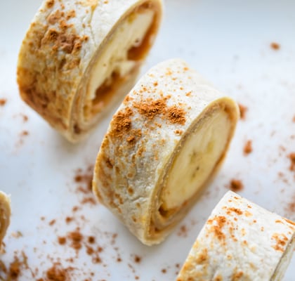 Raširite tortilju na ravnu površinu i premažite je tankim slojem kikiriki putera. Na jedan kraj stavite celu bananu, pa pažljivo urolajte tortilju što čvršće možete. Zatim oštrim nožem isecite rolat na manje komade, tako da izgledaju kao mali slatki suši zalogaji.