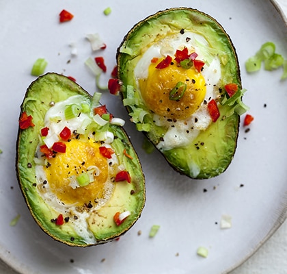 Avokado prepolovite i izvadite košticu. Ako je potrebno, izvadite još malo sredine kašičicom kako bi bilo dovoljno mesta za jaje. Stavite polovine avokada u malu posudu za pečenje tako da budu stabilne. U svaku polovinu pažljivo razbijte po jedno manje jaje, pa posolite i pobiberite po ukusu. Pecite u rerni na 180°C oko 12 do 15 minuta, u zavisnosti od toga koliko želite da žumance ostane mekano. Poslužite odmah.
